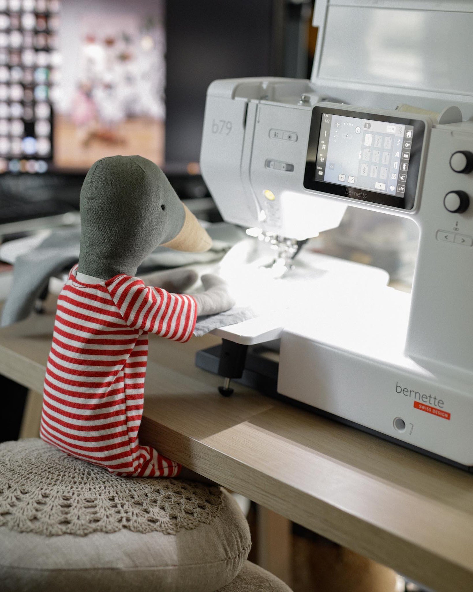 Every now and then, she gets a little help — Moti the Duck takes his studio duties very seriously and insists on supervising the stitching.